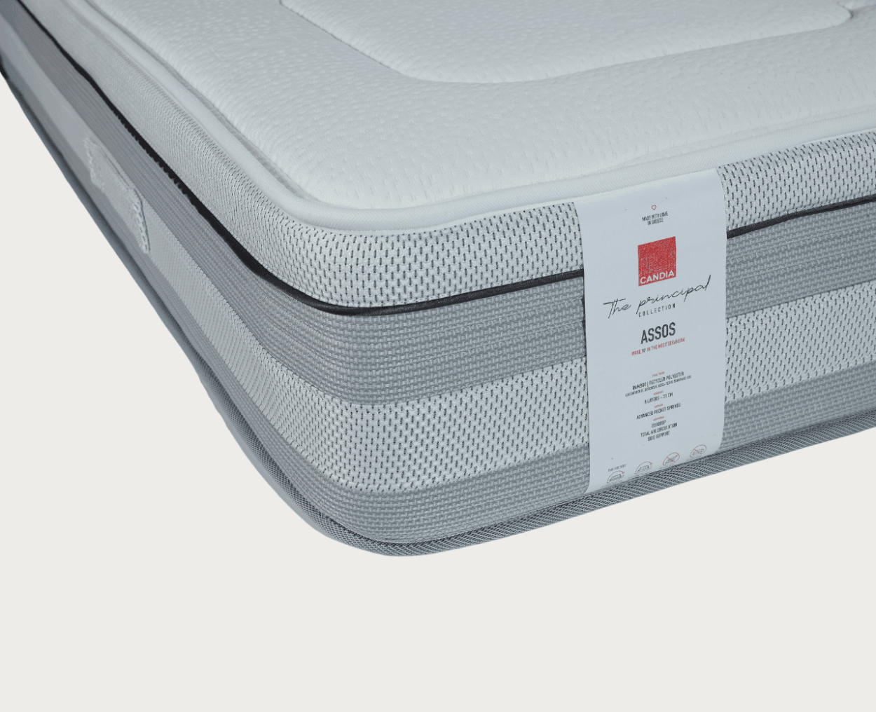 Το απλό ανάγλυφο του στρώματος ASSOS, δεν μαρτυρά την πολυπλοκότητα της σύνθεσης στο εσωτερικό του. Η στήριξη παρέχεται από το Advanced Support σύστημα υψηλότερων ελατηρίων και η άνεση εξασφαλίζεται από πυκνές στρώσεις από Soft Touch Foam αφρώση υλικά. Στο ανώτερο επίπεδο υπάρχει επίστρωση από Dacron Pad για υψηλή αίσθηση άνεσης. Η άνεση ολοκληρώνεται από το ενσωματωμένο ανώστρωμα (Eurotop) με επιπλέον στρώσεις από αφρώδη υλικά. Το ύφασμα παράγεται από BAMBOO με ανακυκλωμένο πολυεστέρα που διατηρεί την θερμοκρασία του ύπνου και σας προστατεύει από μικροοργανισμούς.