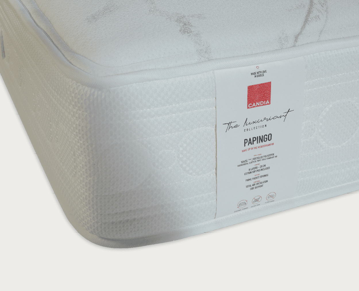 Το στρώμα PAPINGO περιέχει διπλές στρώσεις από μαλακά υλικά Basic Comfort Plus Foam που προσφέρουν την επιπλέον άνεση που χρειάζεστε κατά τη διάρκεια της νύχτας, ενώ η βασική στήριξη παρέχεται από το σύστημα ανεξάρτητων ελατηρίων Prime Support. Στην ανώτερη στιβάδα του στρώματος υπάρχει μια ενισχυμένη στρώση από βαμβάκι για επιπλέον άνεση, που προσφέρει και φυσικό αερισμό του στρώματος για σωστή διατήρηση της θερμοκρασίας κατά τη διάρκεια του ύπνου. Το ύφασμα Tencel έχει αντιβακτηριδιακή δράση και είναι οικολογικό.